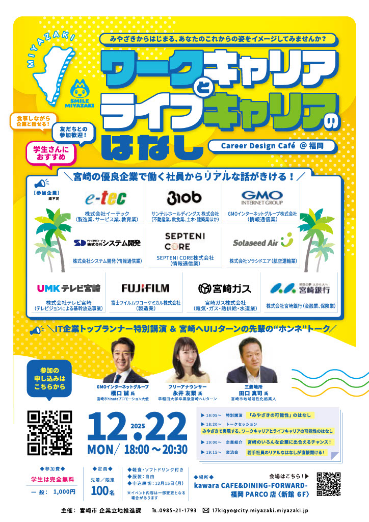 12月22日(土)に福岡県内の大学等に通う学生の皆さんや、宮崎市へのUIJターン就職に関心のある方を対象に、キャリアデザインイベント「~ワークキャリアとライフキャリアのはなし~Career Design Cafe~ @福岡」が初開催されます。