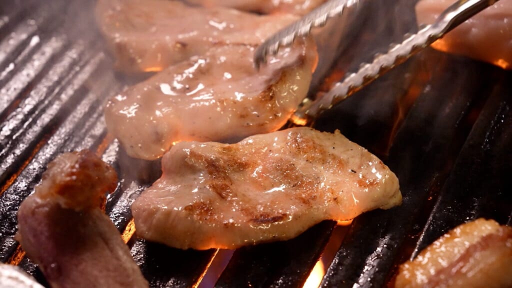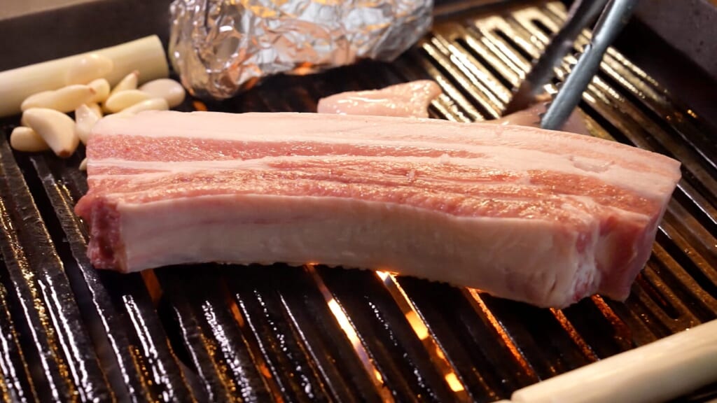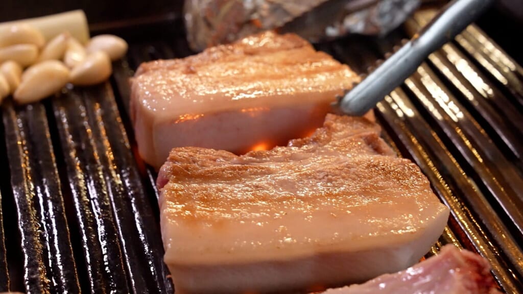 韓国のサムギョプサル店の多くでは、スタッフがテーブルで肉を焼いてくれるのが一般的。「クムテジ食堂」でも専門のスタッフが一番美味しい状態に焼き上げてくれますよ♩