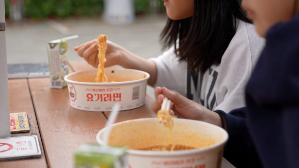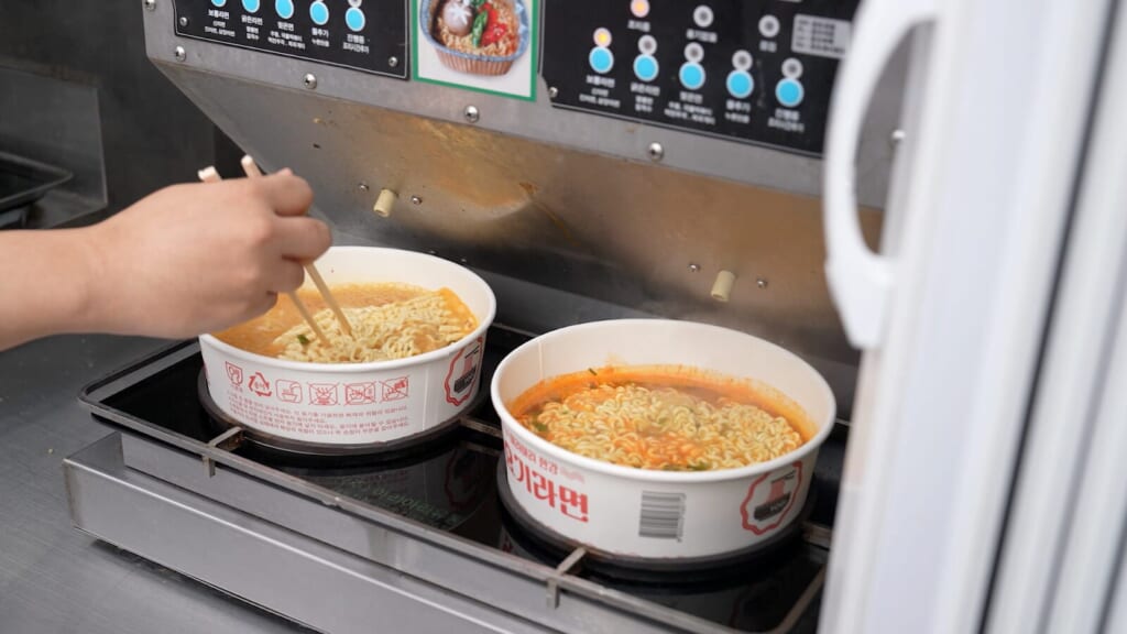 公園近くのコンビニエンスストアで好きな袋麺と卵などのトッピングを購入し、店に設置された専用の調理器を使って作ります。