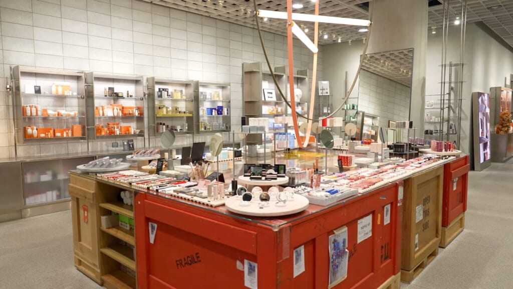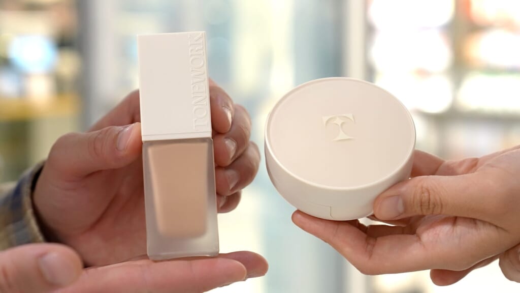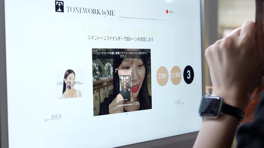 ビル内で特に注目なのが、自分の肌の色に合ったファンデーションをAIが作ってくれる「TONE WORK」(トーン ワーク)というサービスです。顔認証技術と色彩学に基づいて、肌の色に最適なカラーを提案するカスタマイズ型のコスメブランド。