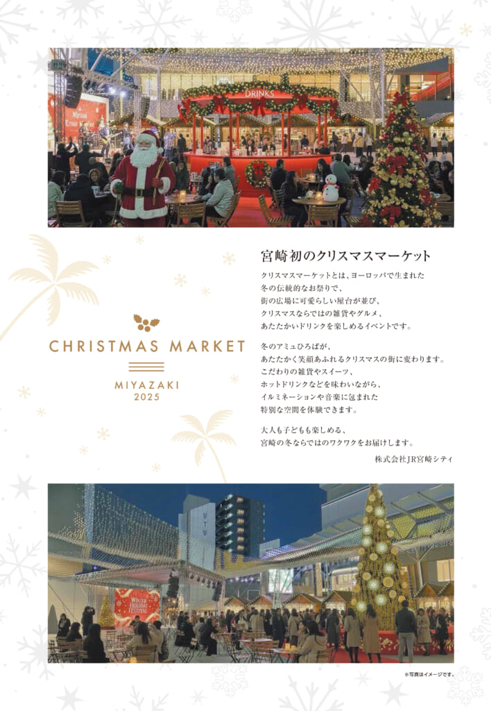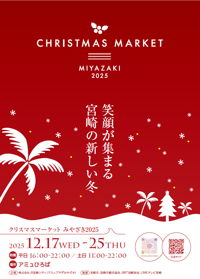 2025年12月17日(水)~12月25日(木)にアミュひろば(JR宮崎駅前)で「クリスマスマーケットみやざき2025」が開催されます!宮崎市中心部の冬の風物詩イベントとして、この規模でのクリスマスマーケットの開催は今回が初めてとなるそうですよ。