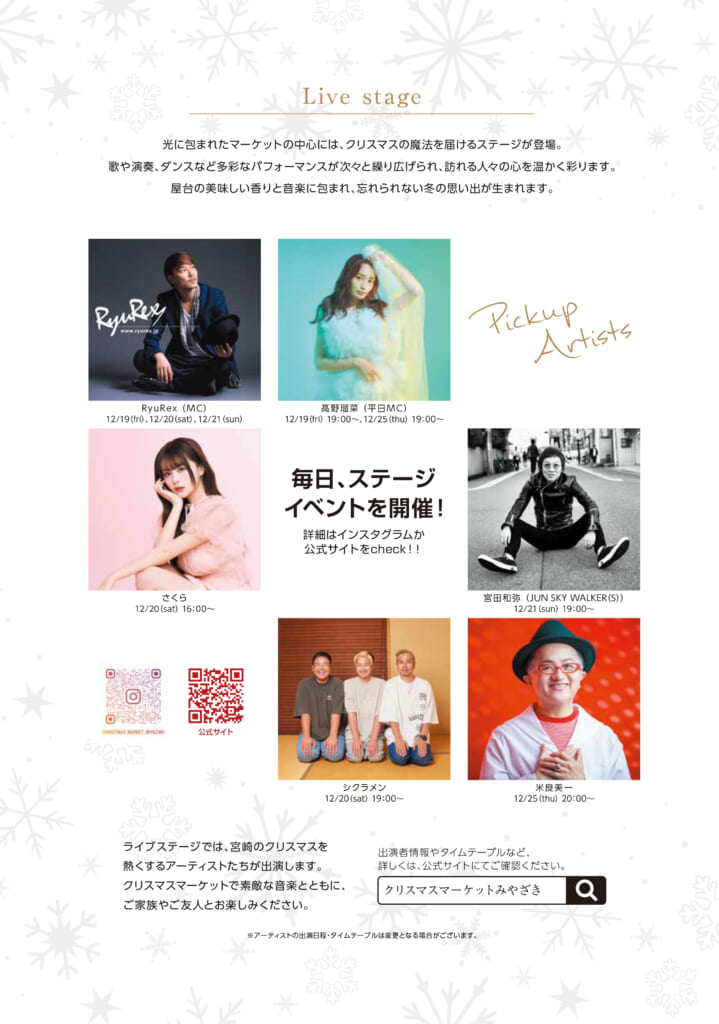 また週末は豪華ゲストも登場!宮崎出身のモデル「さくら」さんや、声楽家で歌手として活躍されている「米良美一」さんもステージに登場します!さらに…12/20(土)、12月24日(水)はサンタが登場するかも…!?🎅お楽しみに♩