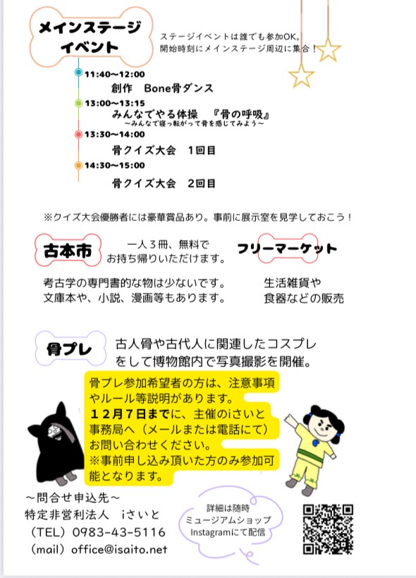 12月20日(土)に宮崎県立西都原考古博物館では、企画展の関連イベントとして「Bone Marche」が開催されます。骨にちなんだ雑貨の販売やワークショップ、古本市(一人3冊まで無料)、クイズ大会など親子で楽しめるイベントですよ♩ぜひ足を運んでみて下さいね♪