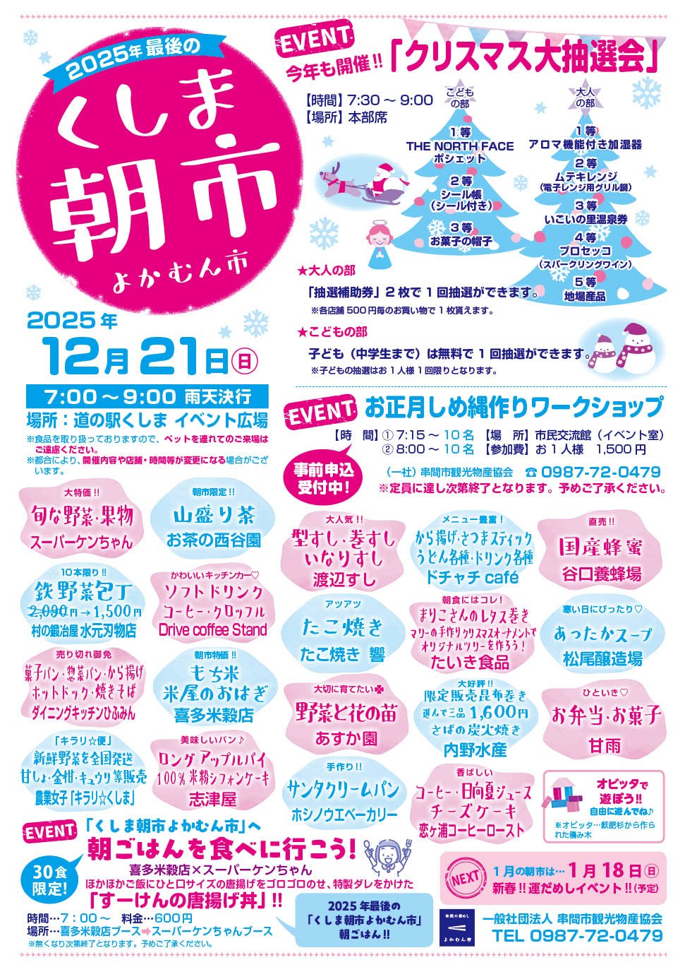 12月21日(日)7:00~9:00に道の駅くしまイベント広場で「くしま朝市よかむん市」が開催されます。当日は、今年1年間の感謝を込めて「クリスマス大抽選会」が開催されます🎄🌟朝市でたくさんお買い物をして素敵な景品をゲットしてくださいね♪