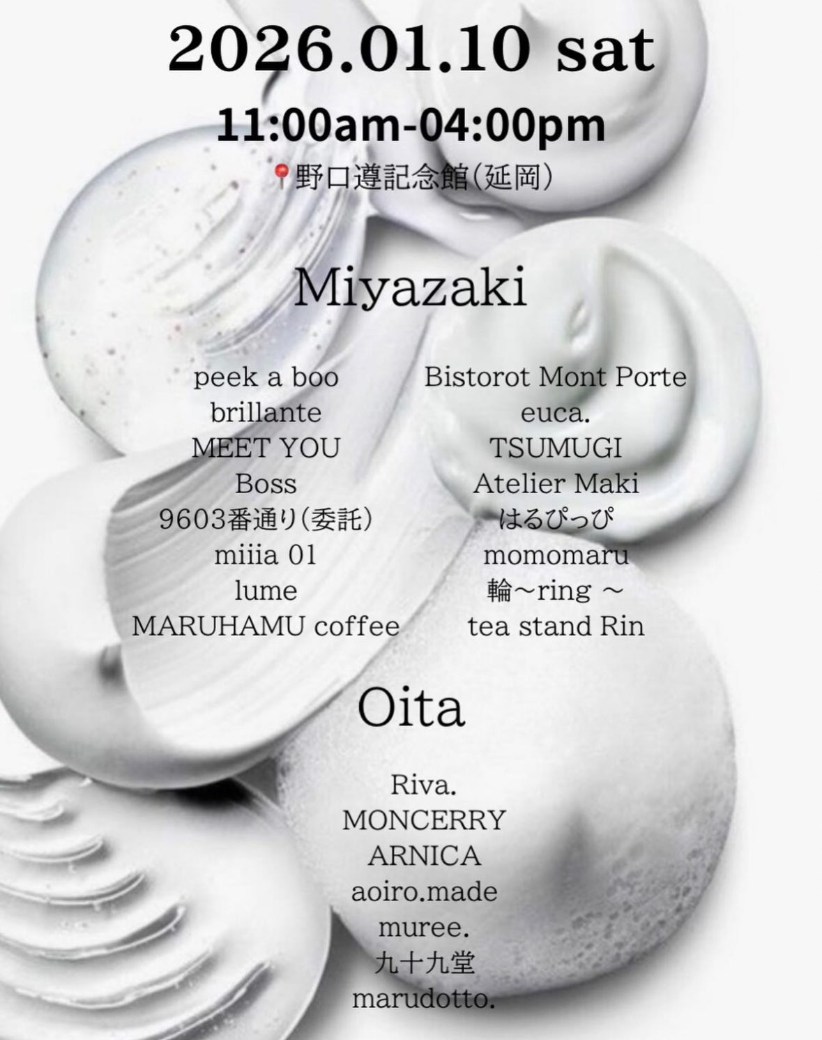 1月10日(土)に延岡市の野口遵記念館にて「SHiRO」が開催されます!宮崎・大分の素敵なお店やキッチンカーが23店舗集結しますよ🌟美味しいご飯やスイーツ・ドリンク・ハンドメイドアクセサリーやアパレル・ワークショップなど盛りだくさん!