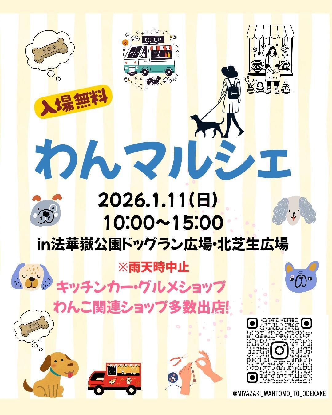 1月11日(日)に国富町の法華嶽公園にて「わんマルシェ」が開催されます!1月11日は”わんわんわん”の日🐶🌟キッチンカーをはじめ、飼い主様向けのグルメショップやわんちゃん関連ショップも出店!総勢、29店舗が勢ぞろいしますよ!※ドッグランは宮崎BUHI会のオフ会の為、一般の方のご利用はできませんのでご了承下さい。