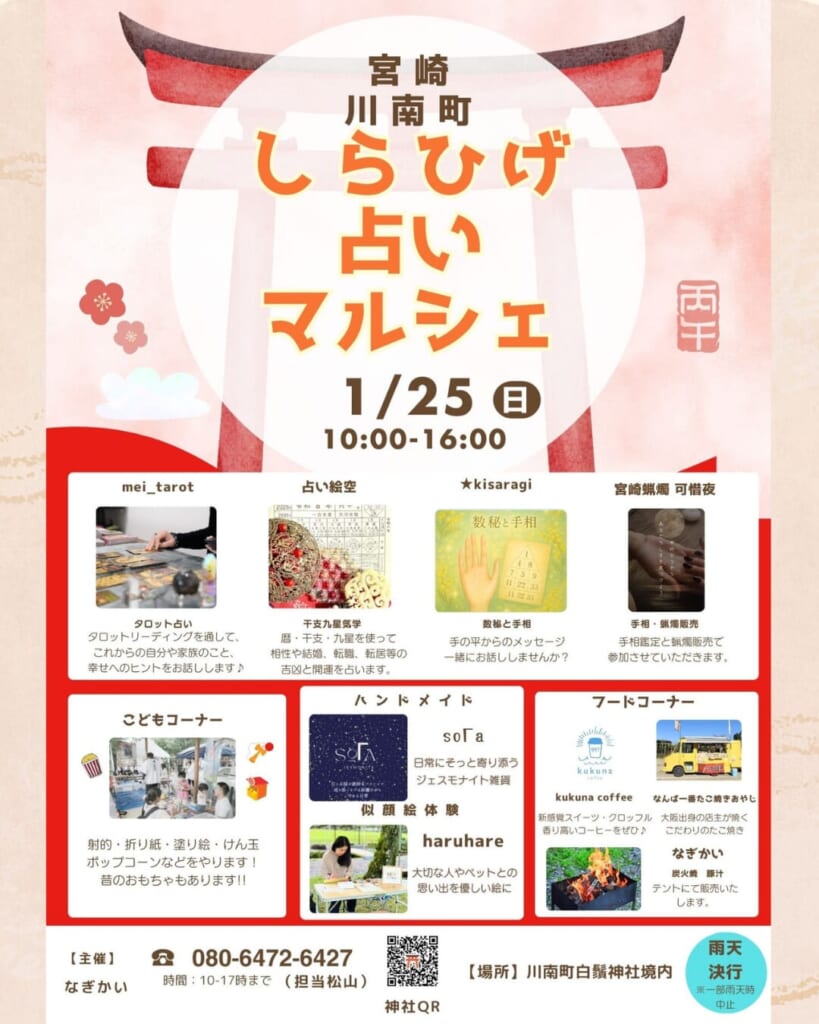 1月25日(日)に川南町の白髭神社では「しらひげ占いマルシェ」が開催されます。キッチンカーの出店や、昔ながらの遊びができる子供コーナーもありますよ♪新しい年のはじまりに、白鬚神社で、ご縁と歩みを大切にするひとときをお過ごしください♪