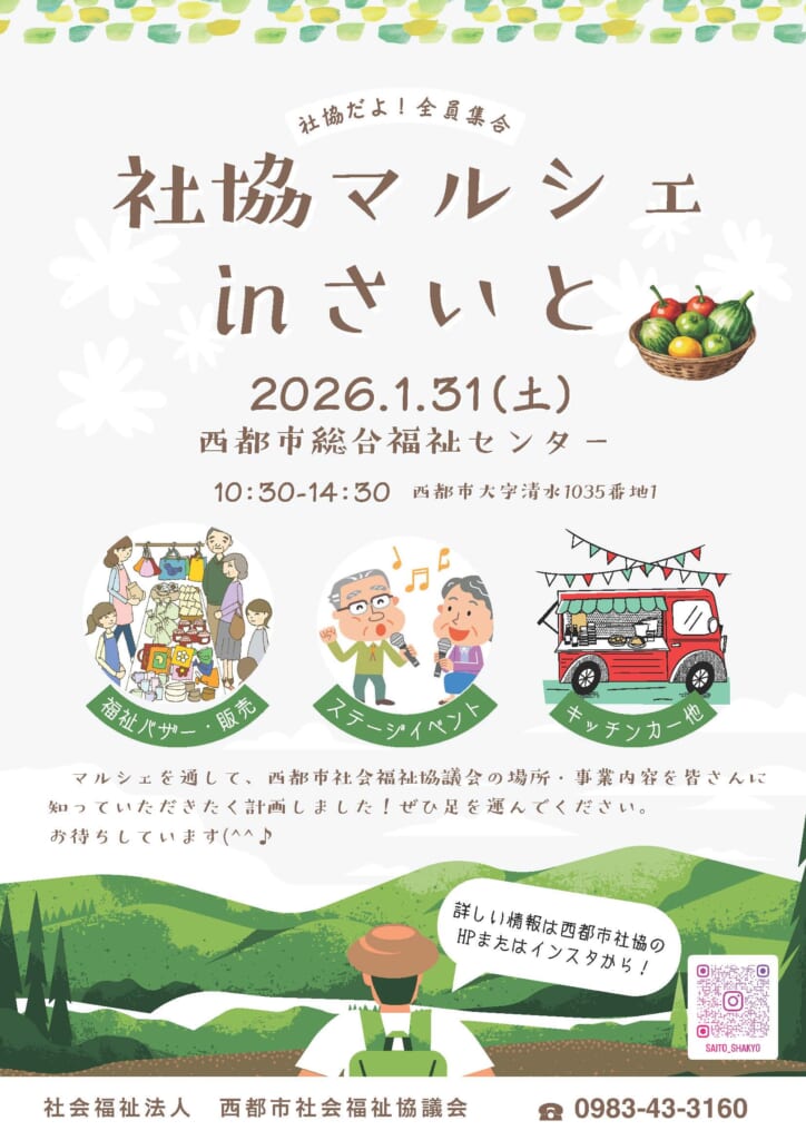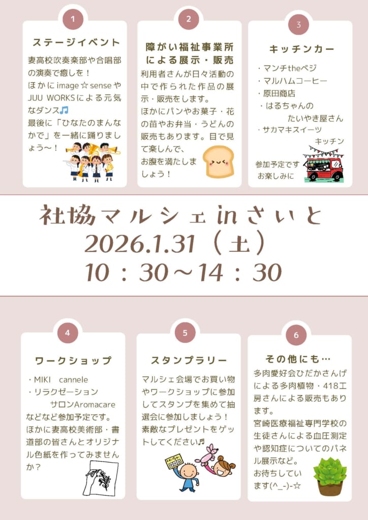 1月31日(土)10:30~14:30に西都市総合福祉センターにて「社協マルシェinさいと」が開催されます。福祉バザーや販売、ステージイベント、ワークショップなど楽しい企画がたっぷりです♪当日は宮崎県内からキッチンカーも集合!美味しいグルメも楽しめますよ。
