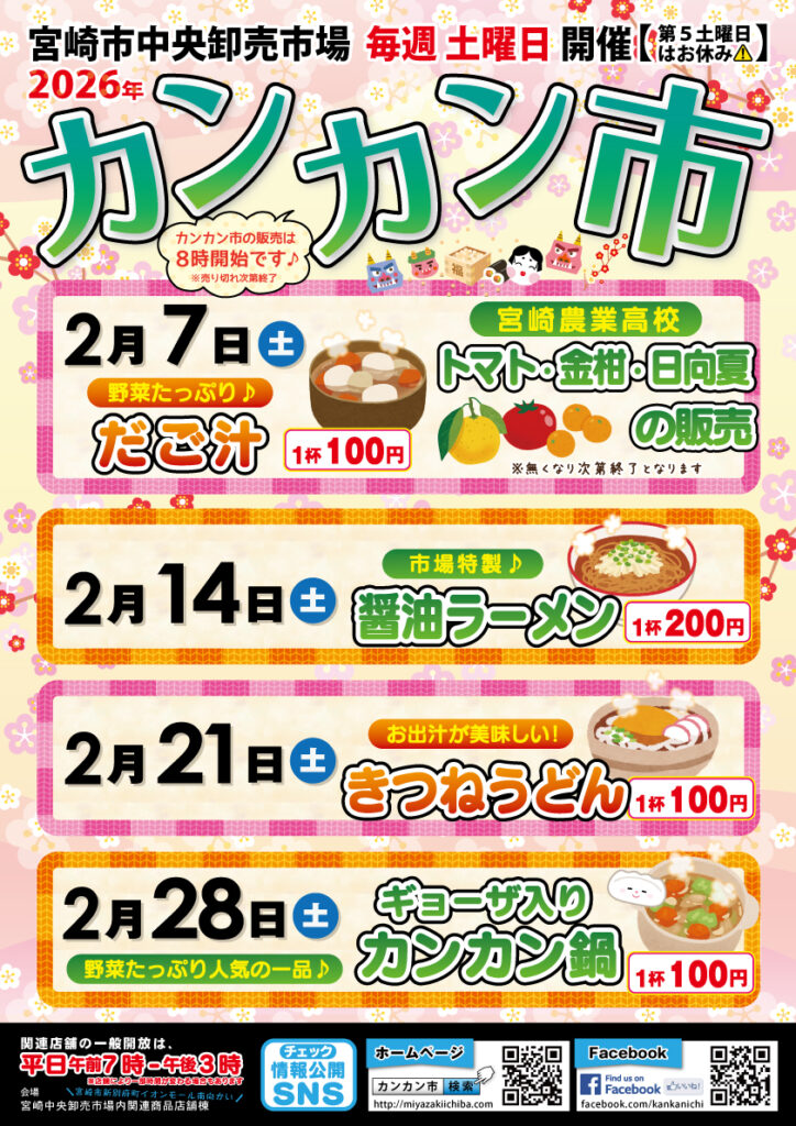 2月7日(土)、宮崎市中央卸売市場にてカンカン市が開催されます!毎月第1、第3土曜日に開催されるカンカン市は毎回多くの人で賑わい、旬のものや野菜たっぷり鍋の販売等、季節によって様々なイベントが行われています。