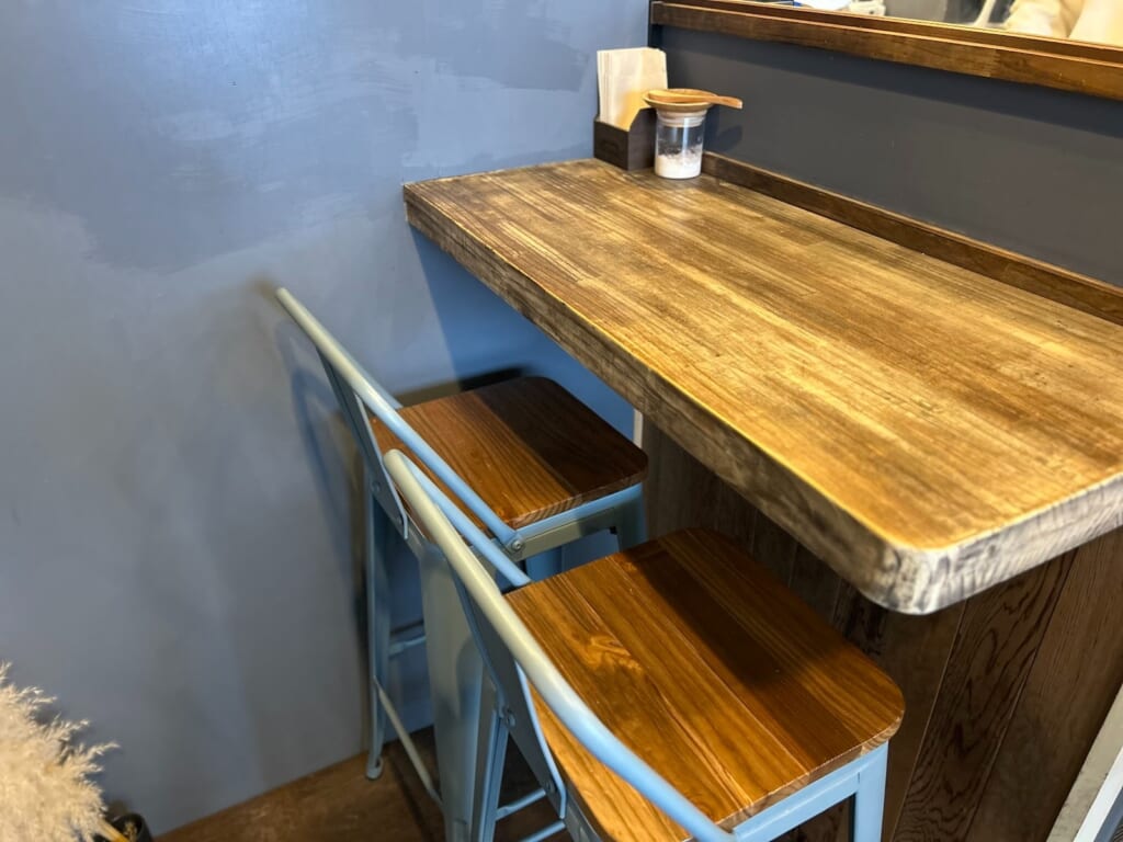 扉を開けると、グレーを基調とした壁紙が印象的で落ち着いた雰囲気です。テイクアウトがメインなので、気軽に立ち寄りやすいのも魅力◎イートインは2名掛けの席のみで、予約はできませんが、席が空いてれば利用できるので、タイミングがあえばラッキーです♩