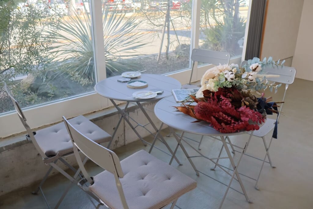 お店に入ってすぐ目に入るのは、オーナーこだわりのアート作品。写真スタジオとしても使われている店内は天井が高く、自然光がやわらかく差し込む開放的な空間が広がっています。
