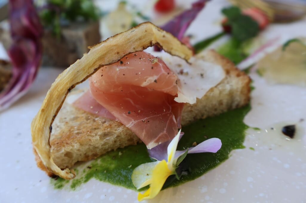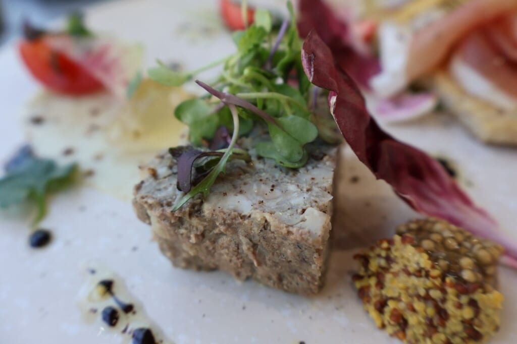 まず、前菜で運ばれてきたのは、鶏レバーとハツのパテドカンパーニュ。盛り合わせの野菜は全て宮崎県産。レバー特有のクセや臭みは驚くほど感じられず、なめらかでクリーミーな口当たりが印象的でした。