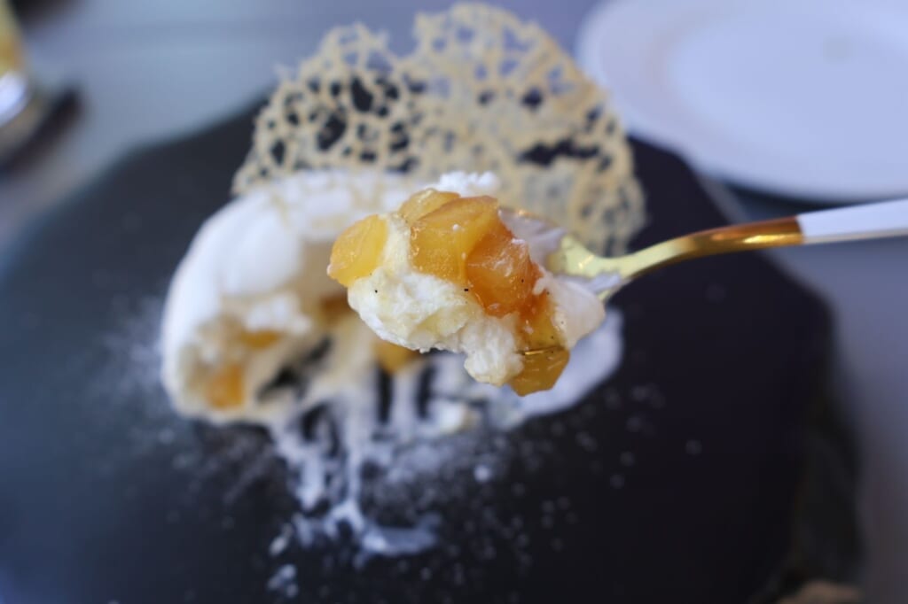この日のデザートはポムドフロマージュ。りんごとチーズで仕立てたムースは驚くほどなめらかで、スプーンを入れた瞬間にふわりとほどける繊細さ。その中には、甘酸っぱさがぎゅっと詰まったりんごのコンフィチュールがたっぷり隠れていて、ひと口ごとに幸せが広がります。