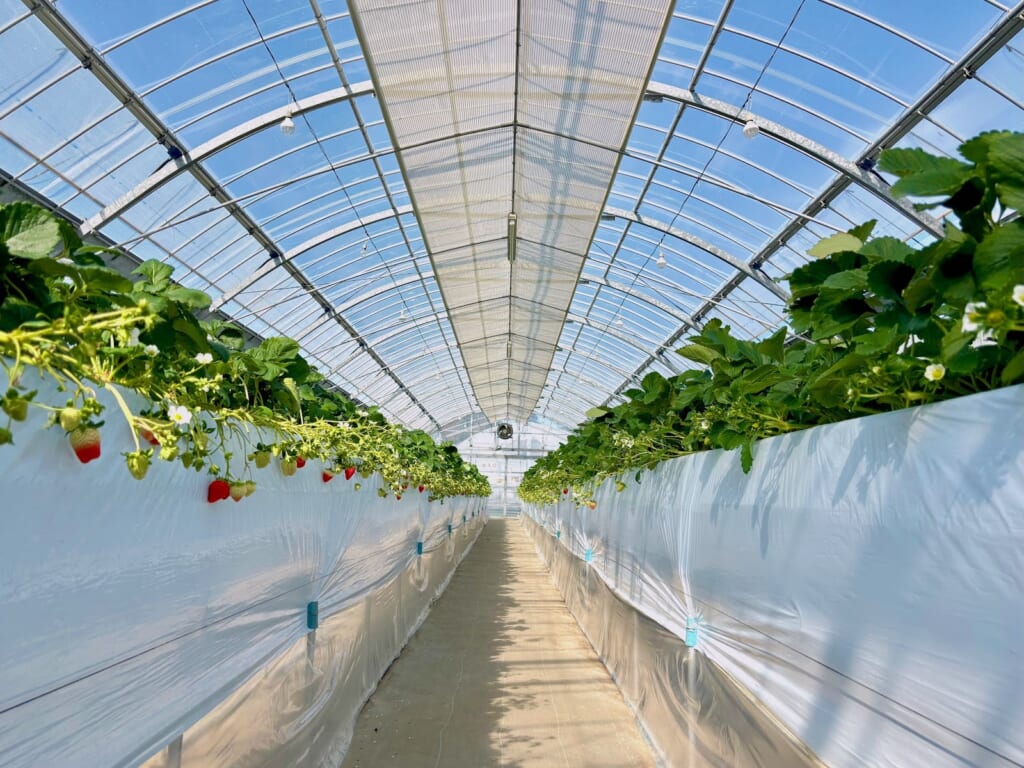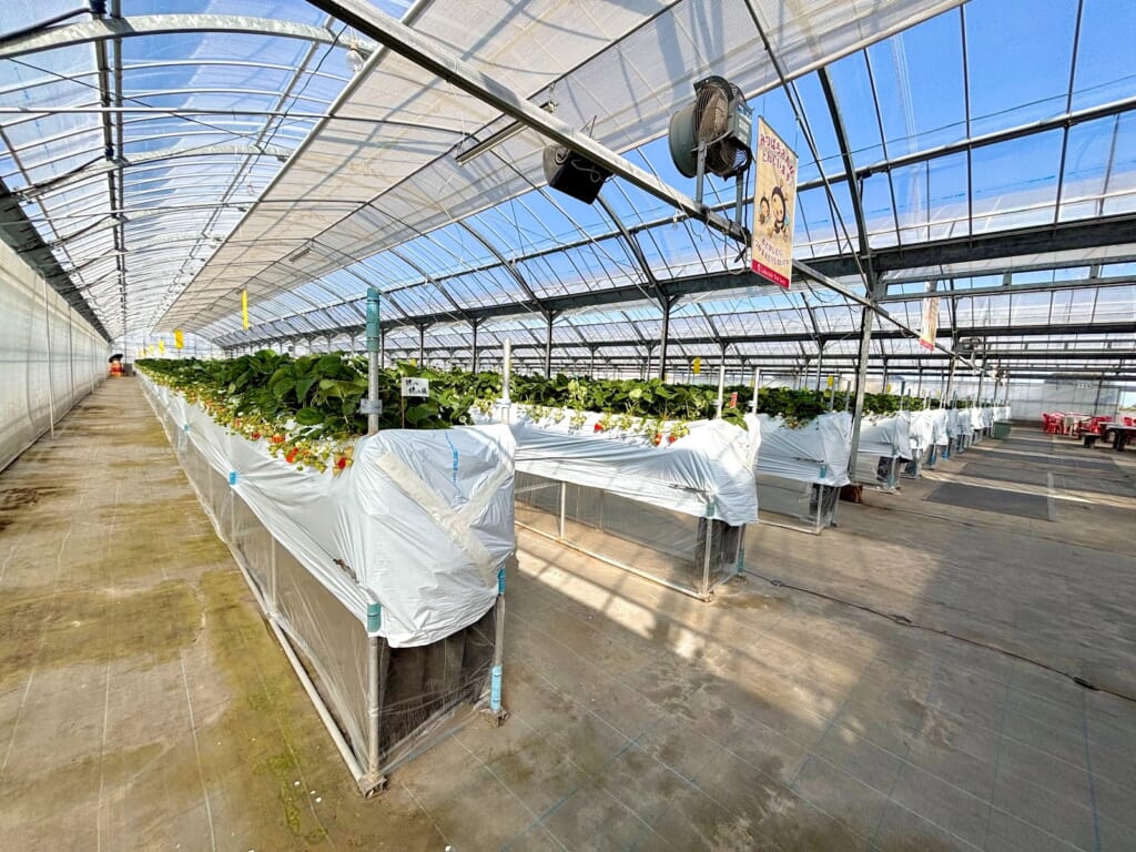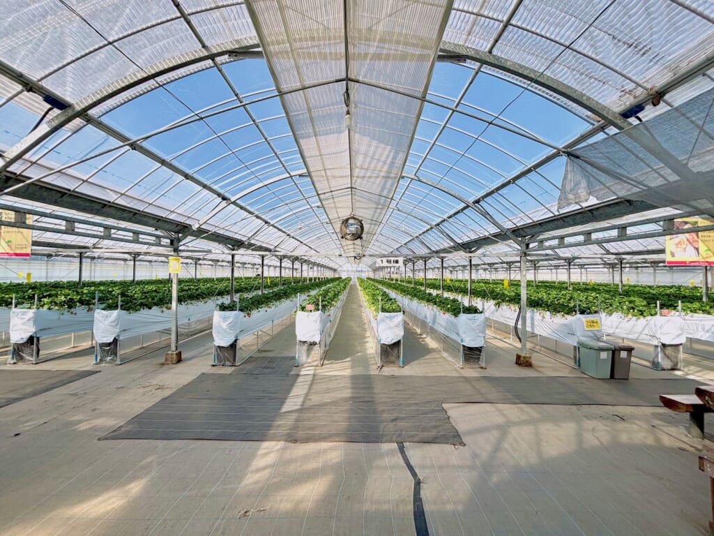 3つのハウスが設備された40rの広い敷地内!ハウスの中に入ると、広々としたきれいな空間に並ぶ真っ直ぐないちご棚が絶景でした!
