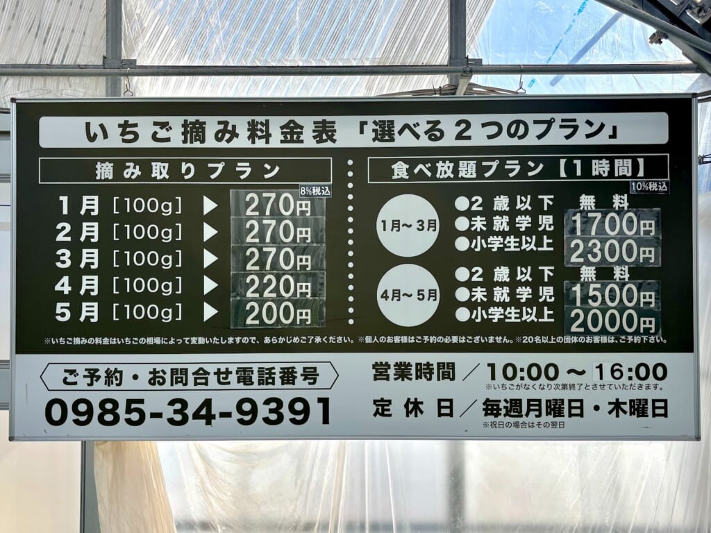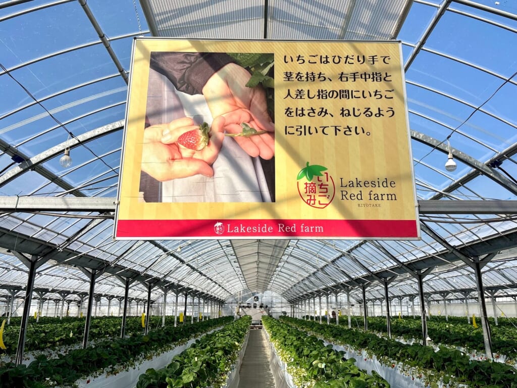 いちごの摘み方が絵と文章で紹介された大きな看板があり、分かりやすい説明で丁寧な施設サービスだなと感じました。