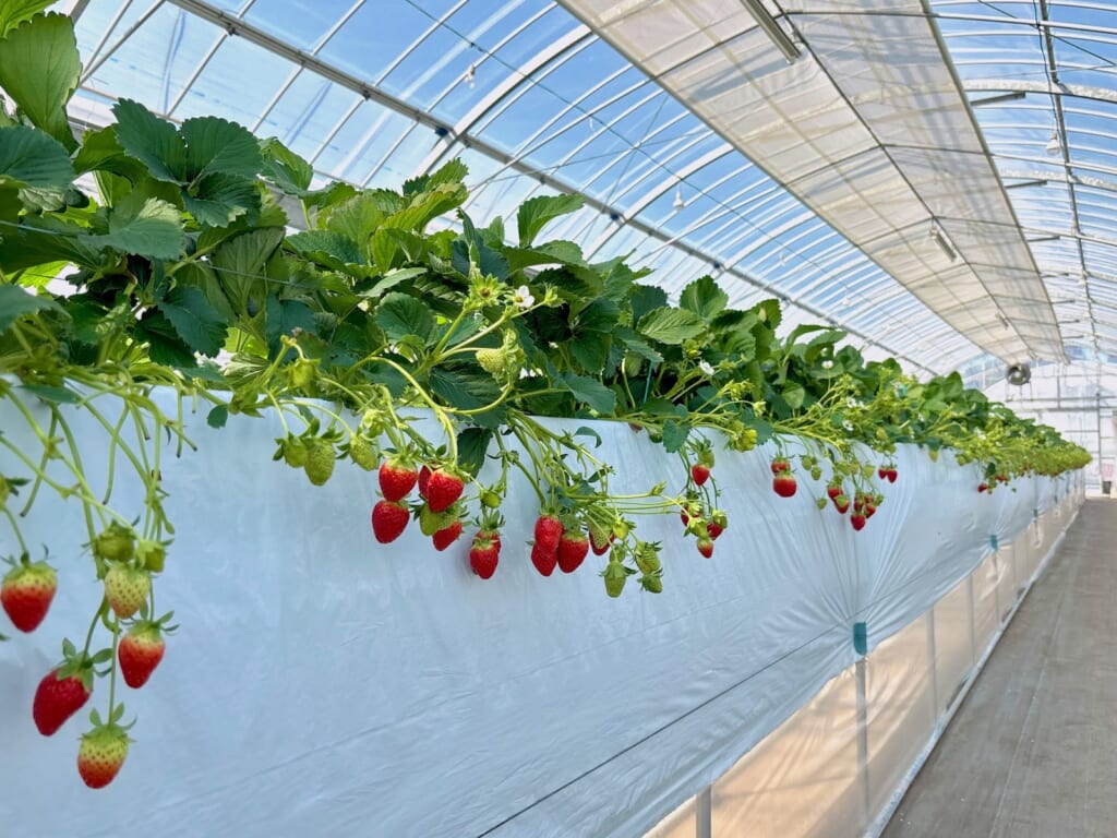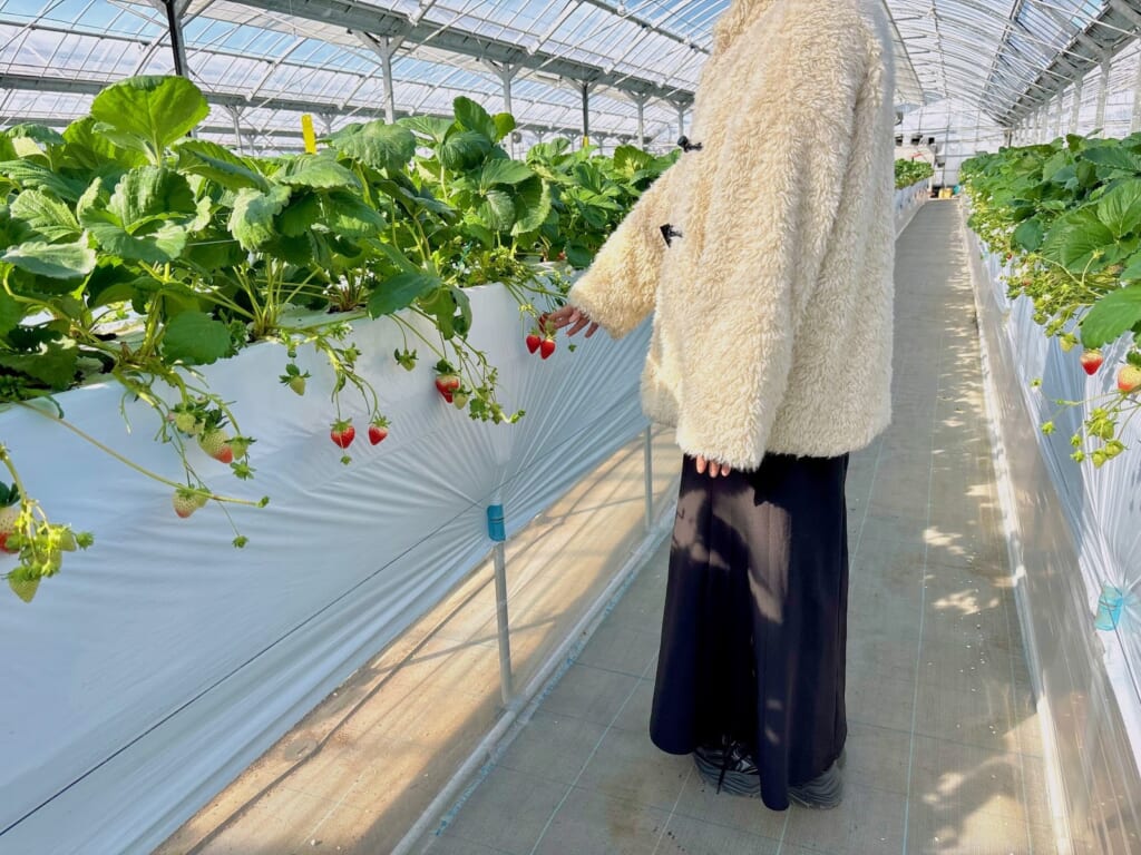 快適な環境ポイント2つ目は、高設栽培になっている点です。子ども目線の高さで車いすの方でも手の届く高さ、そしてかがまずにいちご狩りをすることができる高さであるため、足腰にも負担がかかりづらい高さになっているんです!多くの人に優しい、とてもありがたい環境ですよね!