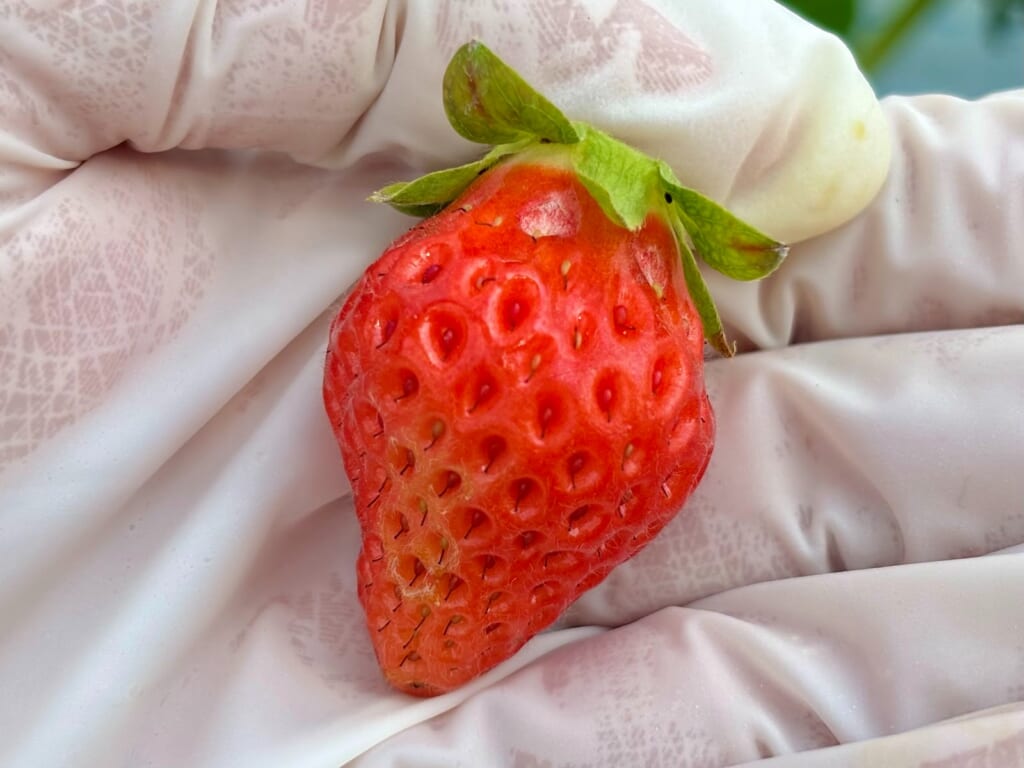 白色の部分がみえないくらい上部まで赤く、へたの下が少し裂けているこちらのいちご。なんとスーパーにも売られていない「完熟」の状態のいちごだそうです!普段食べることのできない、まさに観光農園ならではの1つです!食べてみるとびっくり、柔らかさと甘さがまるでいちごジャムのような美味しさでした!