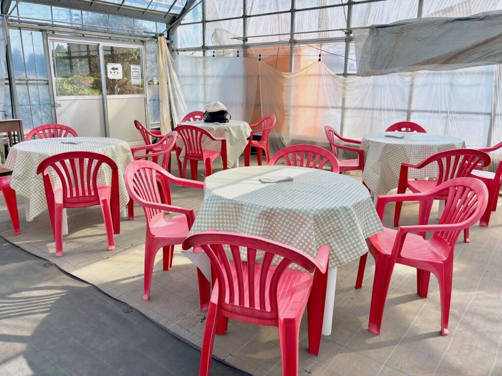 快適な環境ポイント3つ目は、自分で摘んだいちごを座ってゆっくりと食べることができる休憩エリアの充実さです。