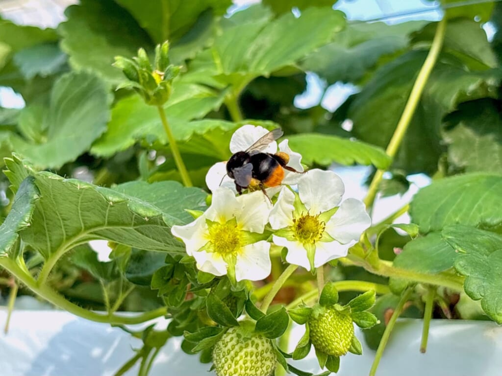 ミツバチよりも安全なハチだとオーナーさんが教えてくれましたよ。甘いいちごを食べることができるのもマルハナバチの働きのおかげですね。