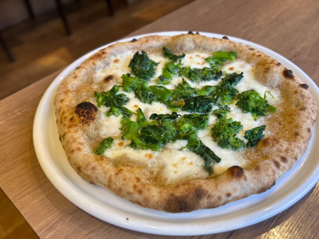薪窯からピザが出てきた瞬間、ふわっと広がる菜の花のいい香り … 生地は外はカリッと香ばしく、中はもちもち 。噛むたびに旨みが広がってシンプルなのに忘れられない美味しさでした。
