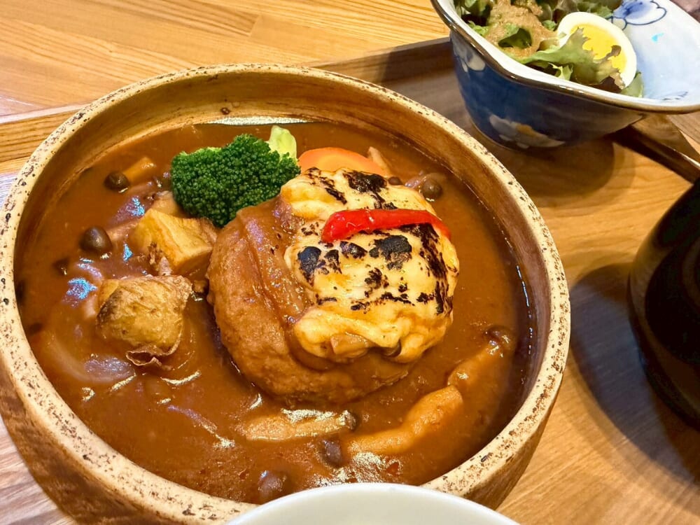 たっぷりのソースの中にはゴロゴロお野菜ときのこたち。国産合挽肉を一つ一つ手ごねして、オリジナルソースでじっくり煮込んだ逸品!コクを足して味わう食べ方もオススメということで今回はチーズをトッピングしていただきました。ハンバーグもしっかり食べ応えがあり、お箸が止まらないソースにメロメロでした。
