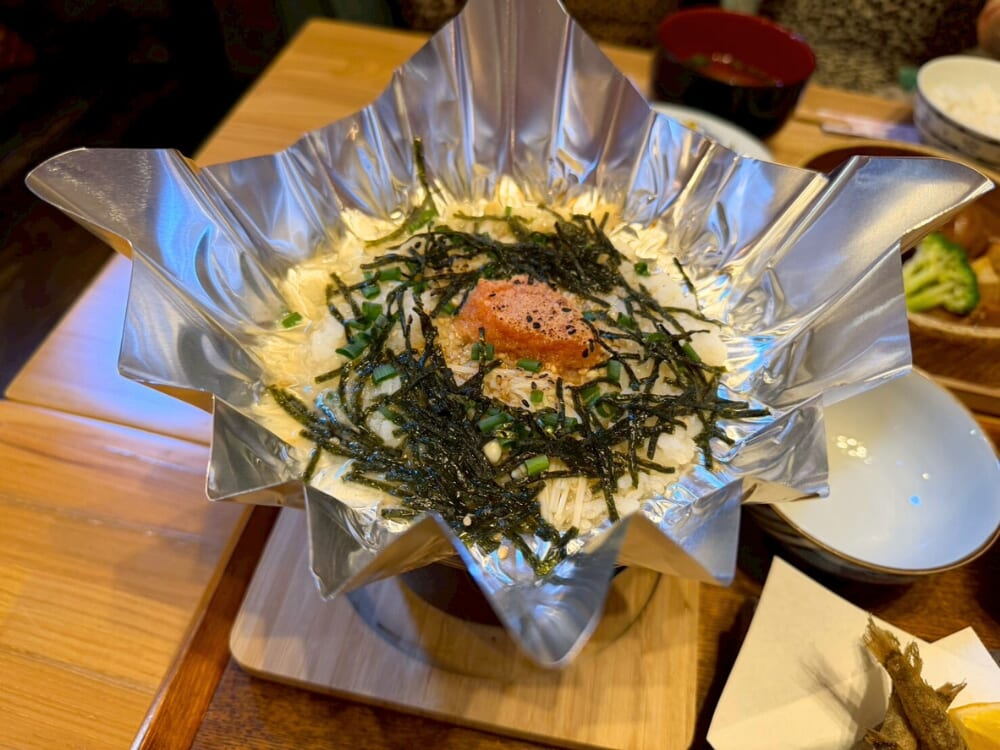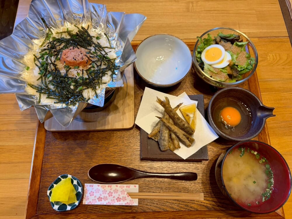 延岡で獲れたてのメヒカリを使用し、ごはんはお店の隣の米農家さんのお米を使っているとのこと。明太雑炊に生卵を溶いて自分で回し入れるスタイルも楽しいですよ♪