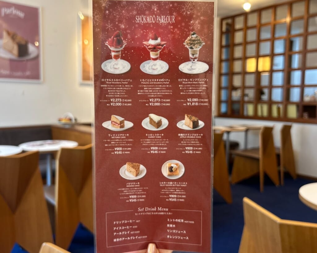 ショウカドウパーラーでは、季節限定の「いちごパフェ」2種類と「モンブランパフェ」を楽しめます。
