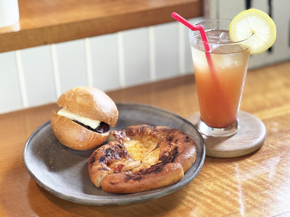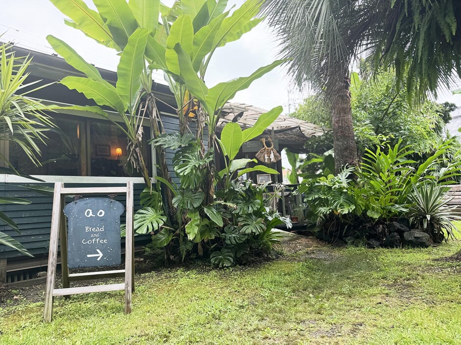 パンの形をしたかわいい看板と南国ならではの植物たちに囲まれた隠れ家ベーカリーです。