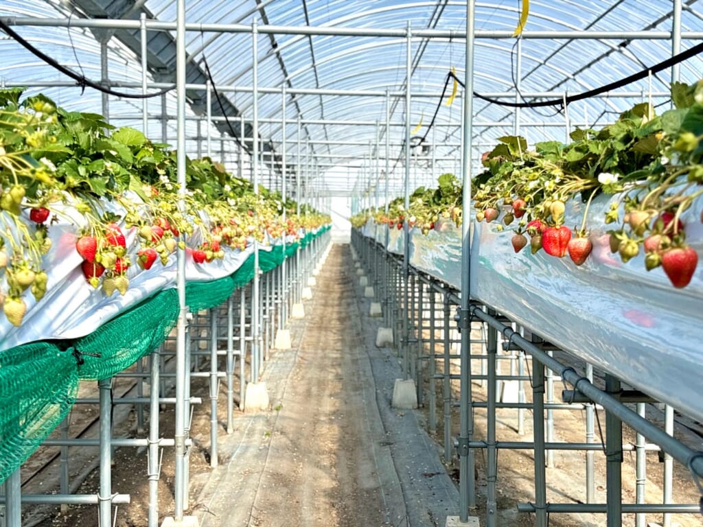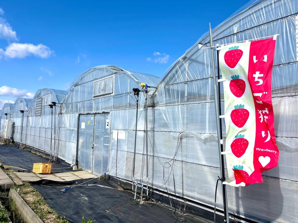 今回いちご狩りを体験させていただいたのは、宮崎市郡司分にある『ひなたいちご園」さん。農地の中を進んでいくと、ハウスが見えてきます。