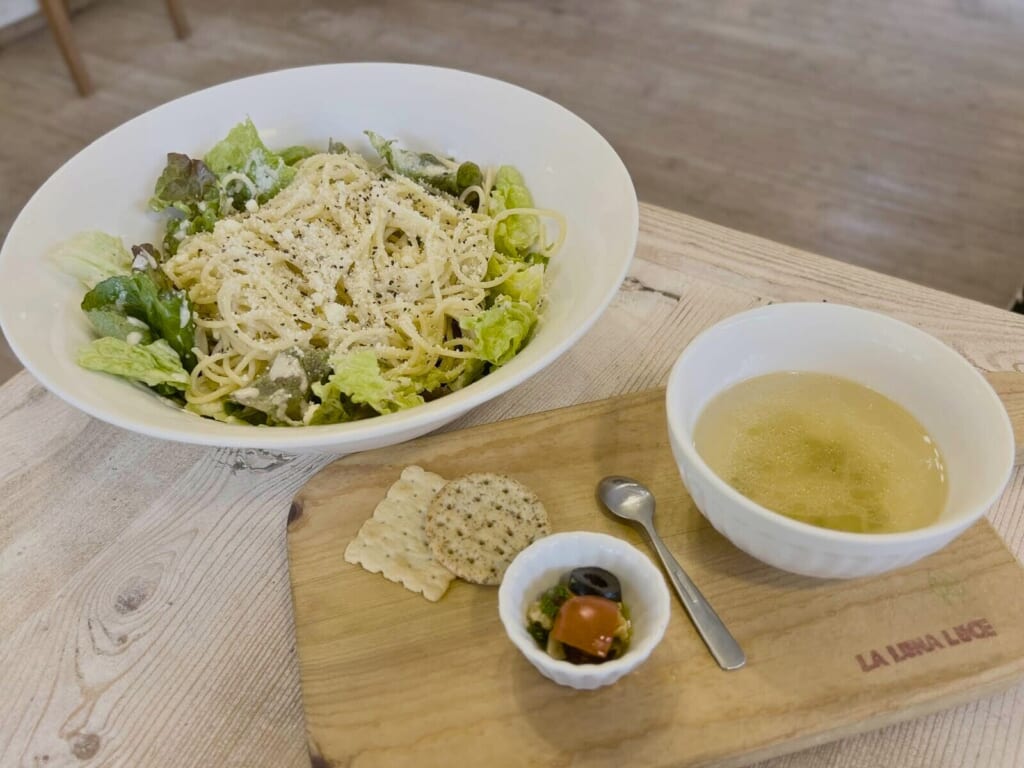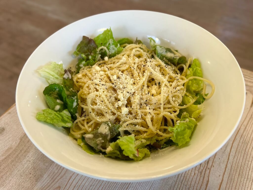 今回はスパゲッティサラダもいただきましたが、これがびっくりするほどのボリュームで驚きました!なんと、セットのサラダの約3倍も入っているそうで、食べ応えも満点。しっかり満足感が得られる一品です◎