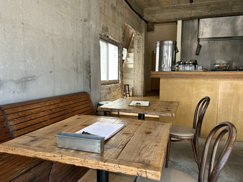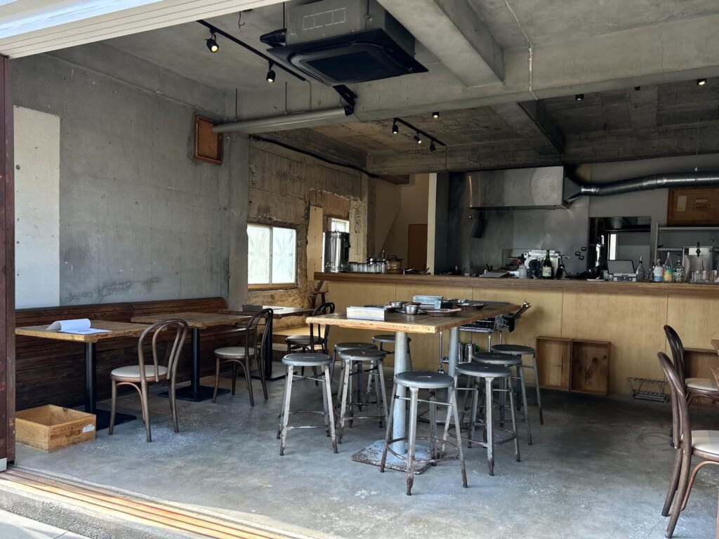 店内は開放的な雰囲気です。コンクリートと木を基調にしたシンプルな空間で、天気の良い日には、やわらかい光が差し込み、外からの風もふんわりと入ってきてとても気持ち良く過ごせます。青島らしいゆったりとした時間が流れていて、思わず長居したくなる心地よさです。