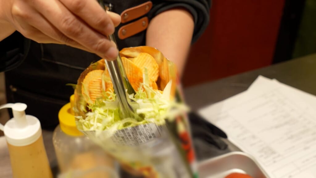 注文すると、まず容器にポテトチップスを敷き詰め、その上にたっぷりのキャベツとフレッシュなトマトを乗せます。