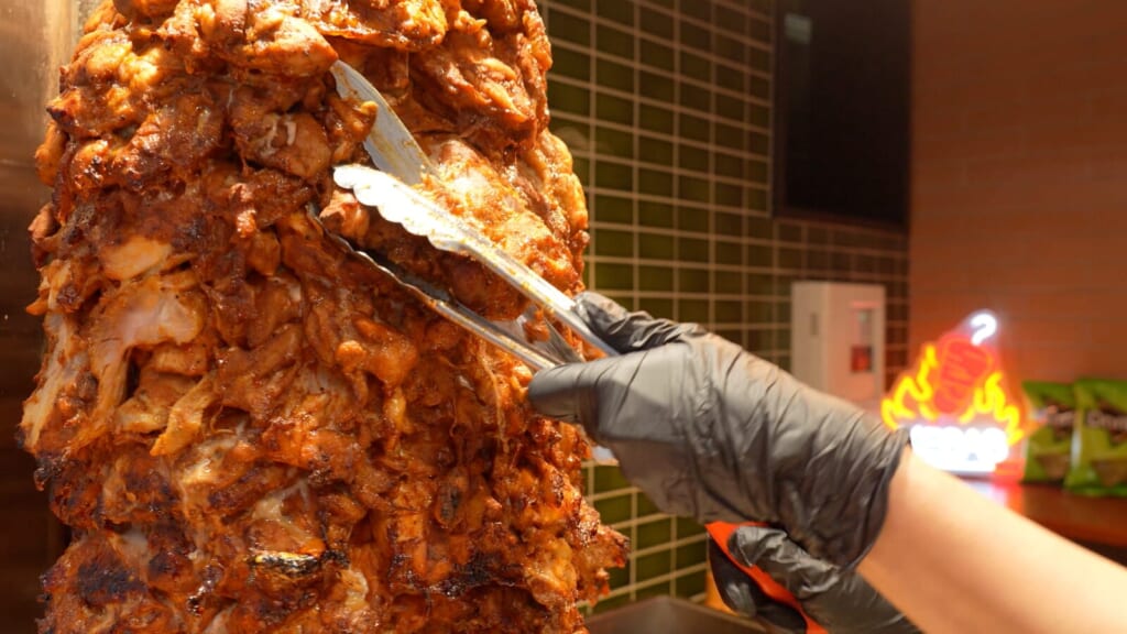 そして、目の前でローストされた肉の塊から、ジューシーなケバブを豪快に削ぎ落としてトッピング!肉汁がしたたる様子はライブ感満点ですよ♩