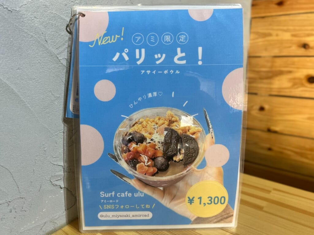実は「 surf cafe ulu amiroad 」は、青島にある人気カフェ「 surf cafe ulu 」の2号店なんです!あみーろーど店は、宮崎駅近くで立ち寄りやすく、アサイーボウルやドリンク、ドーナツなどを気軽に楽しめるのが魅力 ♩