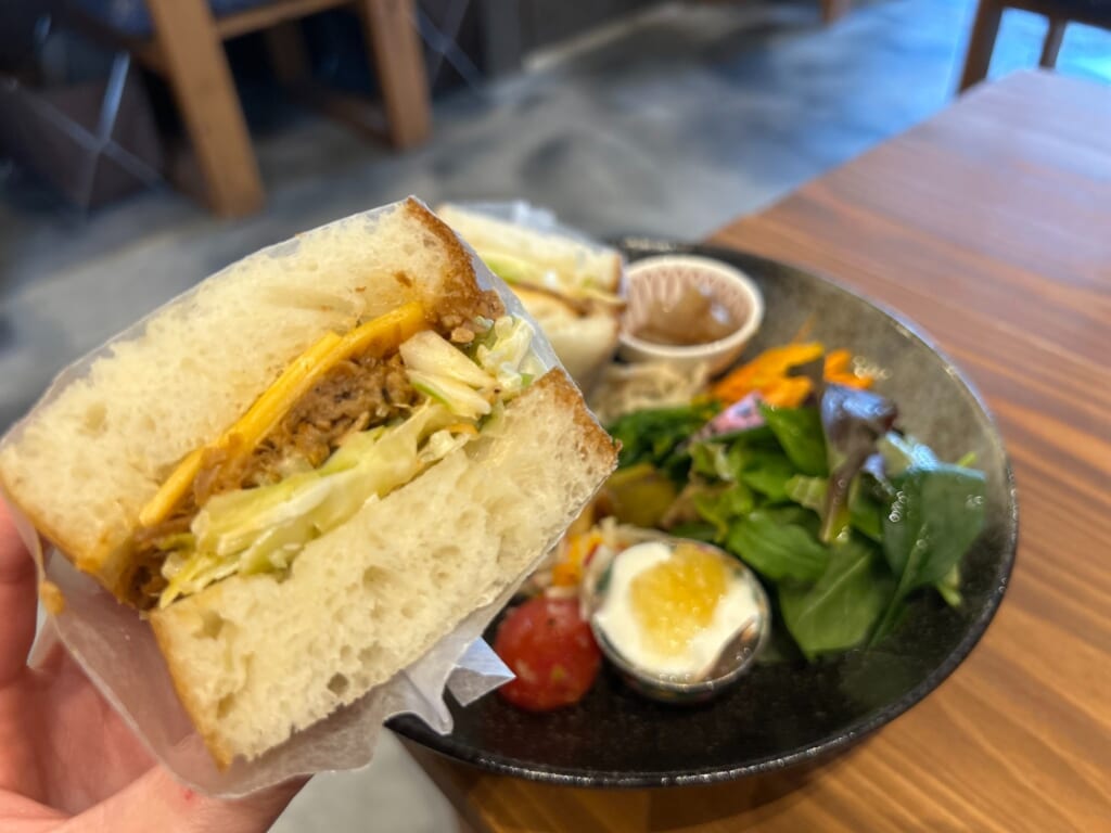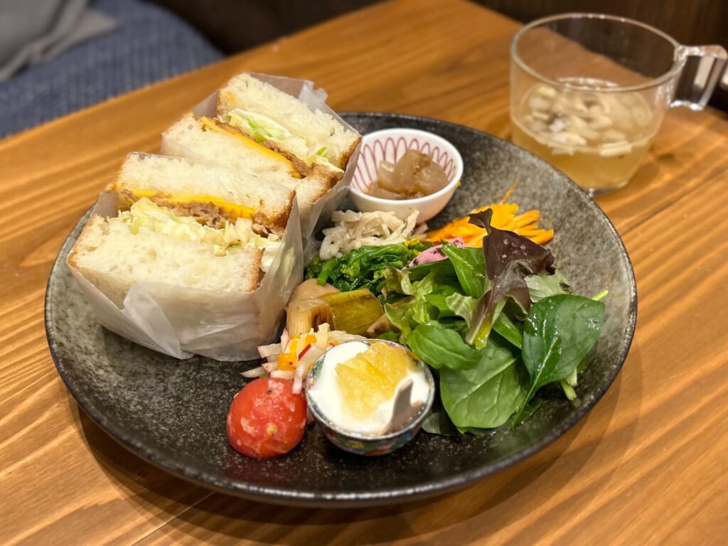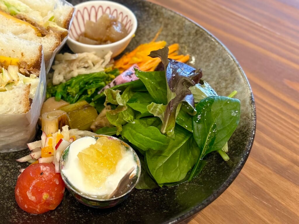 しかも、ただのサンドイッチではありません。プレートには、サラダ・ヨーグルトの他に8種類の副菜まで添えられていて、見た目もとっても華やかなワンプレートになっています!いろんな味を少しずつ楽しめるのもポイントで、野菜までしっかり摂れて、美味しいのはもちろん栄養バランスも嬉しいランチになっています◎