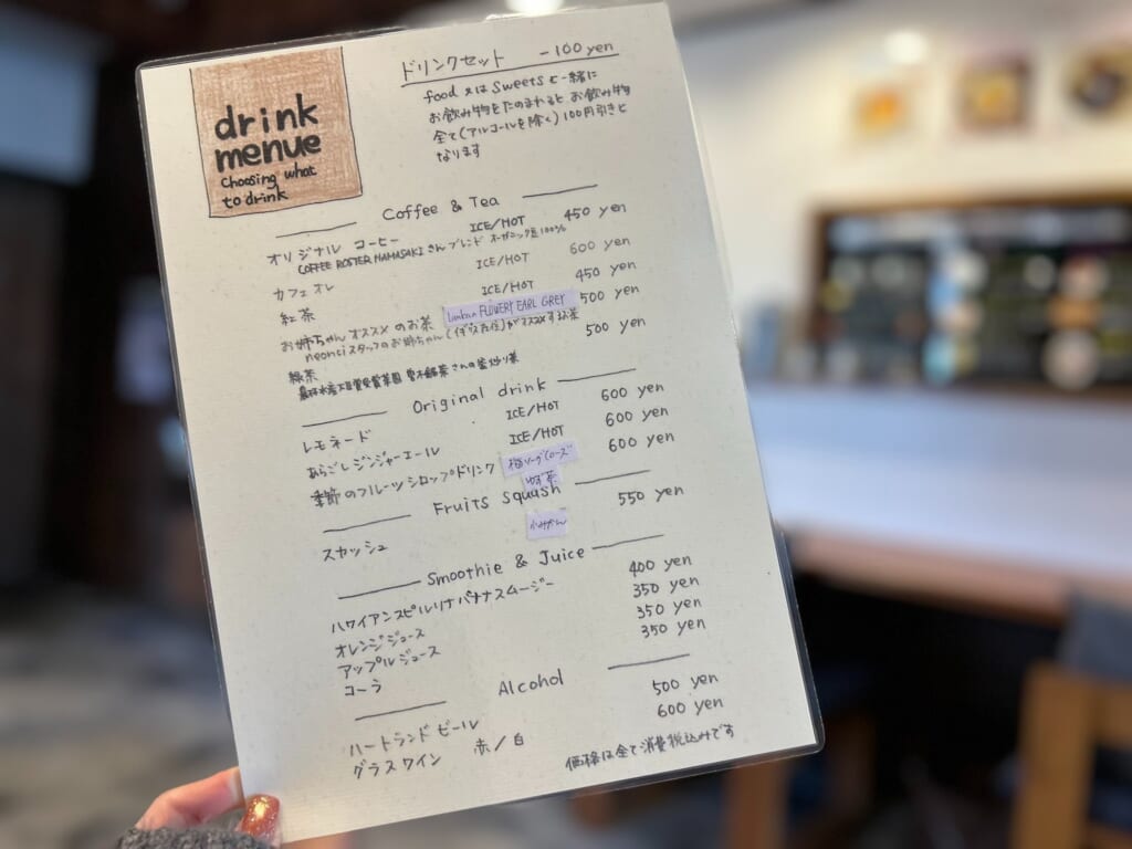 コーヒーや紅茶はもちろん、オリジナルドリンクも充実していて、その日の気分に合わせて選べるのが嬉しいポイントです♩そして、是非オススメしたいのが「今日のおやつ」!なんと、どれを選んでも¥350というお財布にも優しい価格で楽しめます。