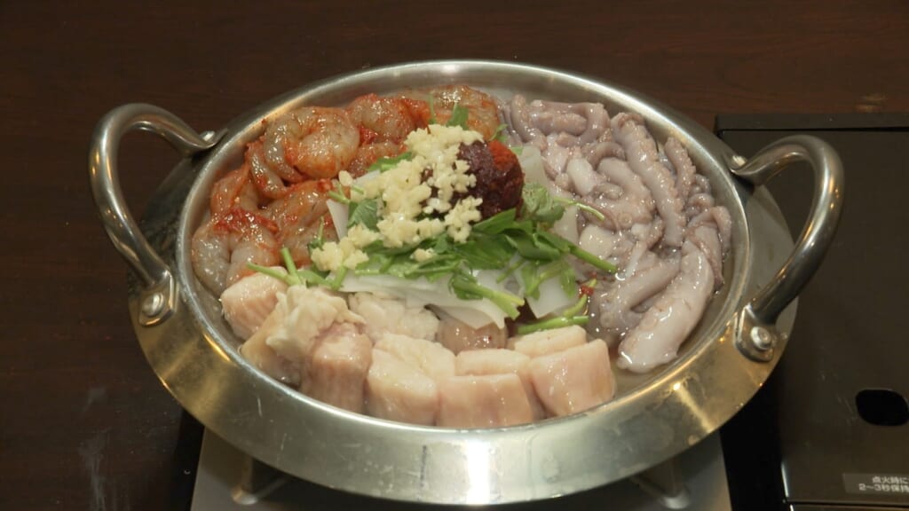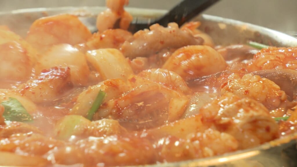 一番人気は、韓国・釜山(ぷさん)発祥の鍋料理「ナッコプセ」。ナクチ(テナガダコ)、コプチャン(ホルモン)、セウ(エビ)という3つの具材の頭文字から名付けられました。プリプリのテナガダコやホルモン、エビがたっぷり。