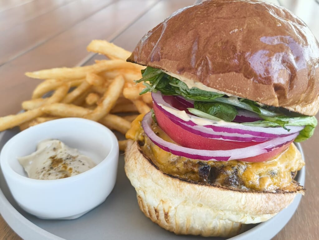 LDKバーガーは肉厚のビーフパティに、チーズ、トマト、レッドオニオン、水菜まで入ったボリューミーなバーガーとフライドポテトのセット。がっつり系ながら野菜のフレッシュさもしっかりあって、最後までおいしく食べられますよ。