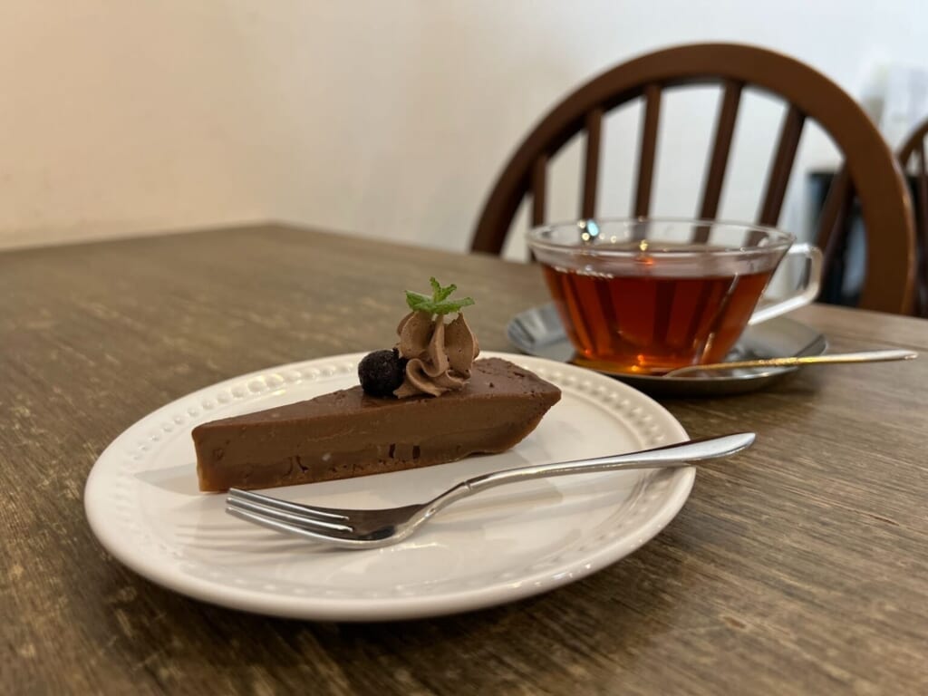 食後のお楽しみは、お店の方にオススメしていただいた「トルタカプレーゼ」。チョコレートの濃厚さがありながらも軽くて食べやすく、最後までペロリといただける仕上がり。まさに ” 罪悪感なく楽しめる ” ご褒美スイーツです。