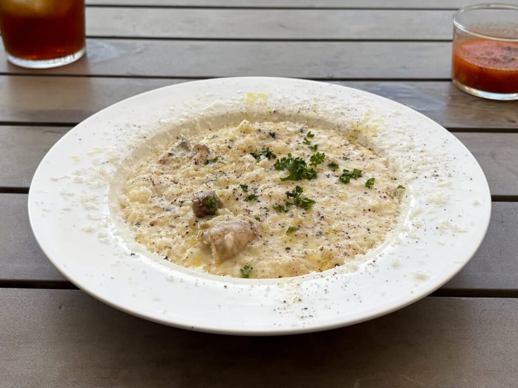 お店イチオシの人気メニューの【カキとキノコのクリームリゾット】。プリっとした牡蠣と香ばしいキノコが濃厚なクリームソースと絡み合った贅沢なリゾットです。