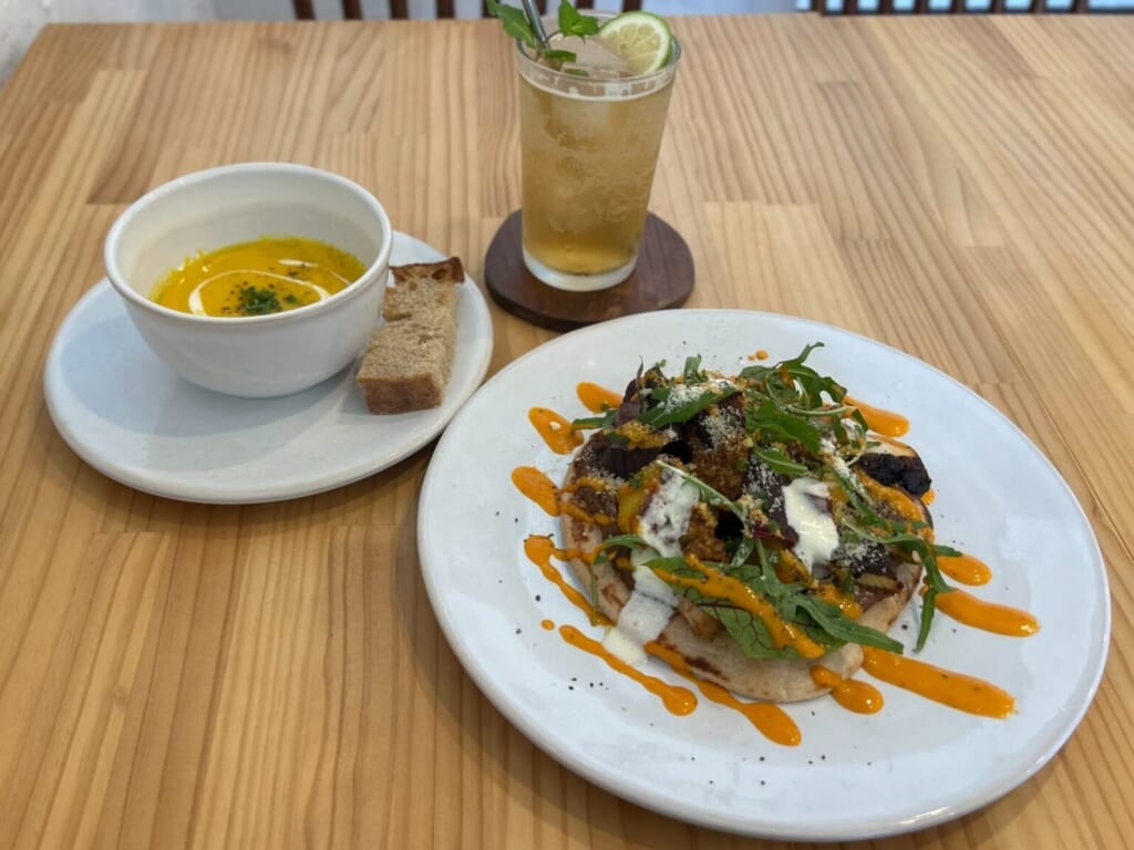 四季通り沿いにあるお店「cafe&grocery HITOKIWA」。季節野菜のプレートランチは季節のスープと自家製フォカッチャがセットで1400円 という嬉しい価格。