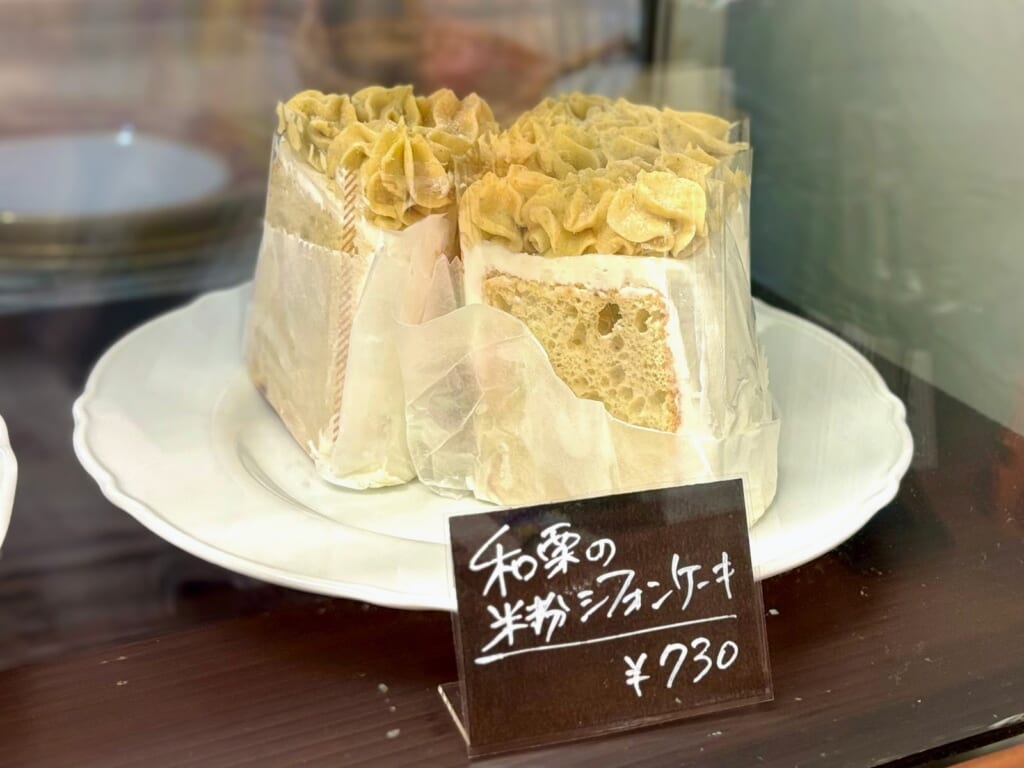 『和栗の米粉シフォンケーキ』は、栗のクリームが、まるで栗そのもの。「くりーって感じ!」と思わず目を丸くするくらいの和栗感を味わえる贅沢な美味しさでした♪栗は、皮むきなどの下処理から手作業で仕込んでいるそうです。丁寧な店主さんの想いがケーキの味に表れているように感じました!