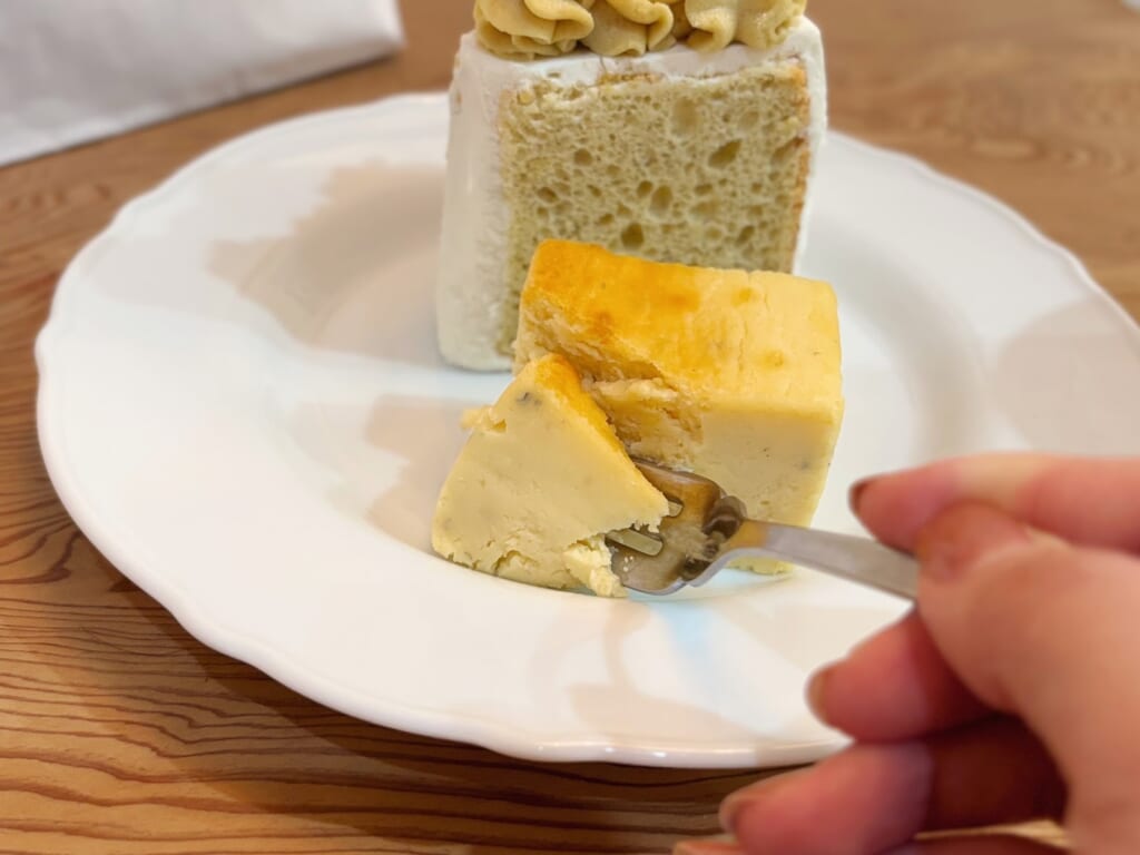 『ゴルゴンゾーラチーズケーキ』は、私が今まで食べたチーズケーキとはまったく別のチーズケーキ!生クリームのなめらかさではなく、濃厚なチーズがしっかりと感じられるテリーヌ感。チーズ好きの私にとってはたまらなく美味しい一品でした!