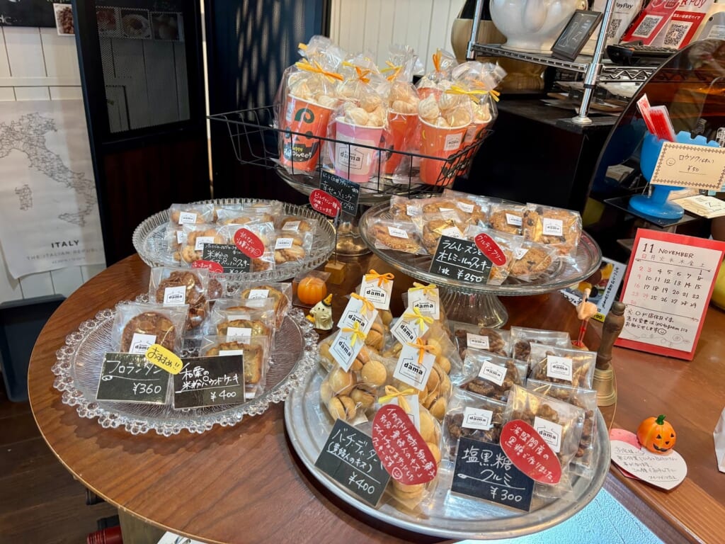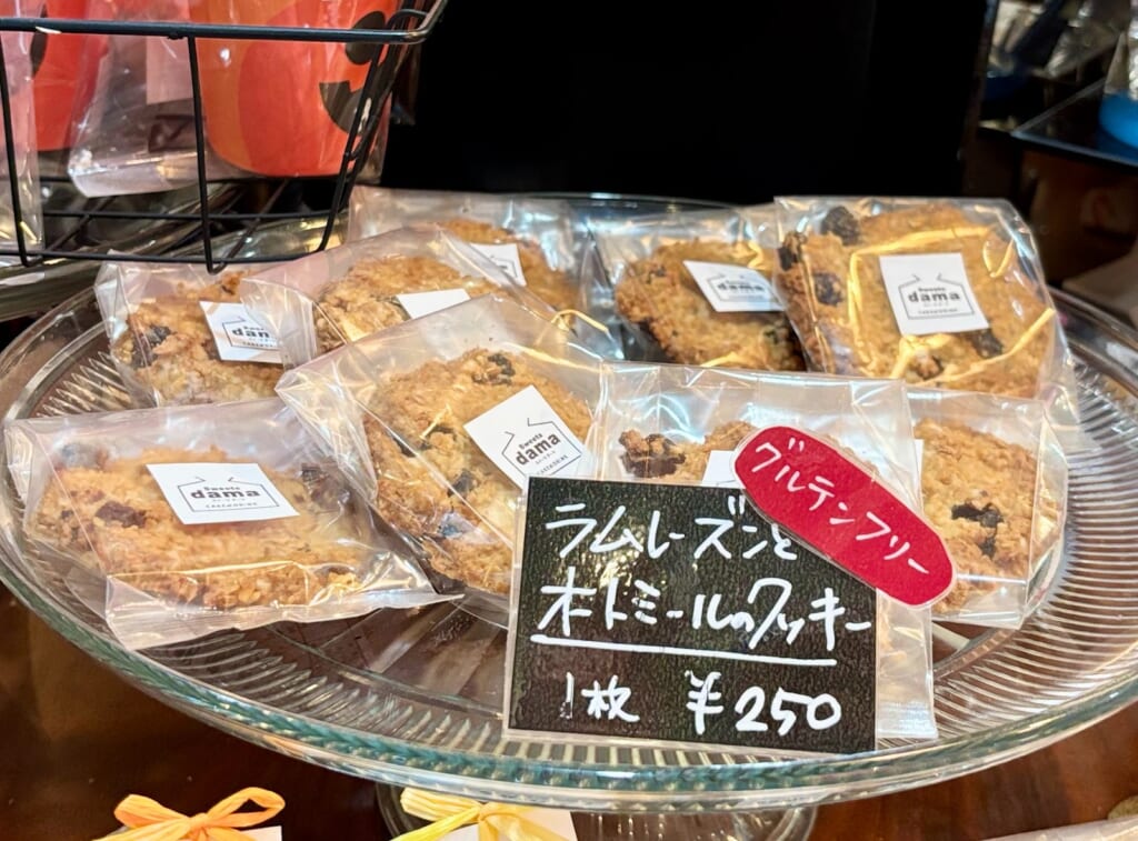 この日のラインナップは、「幸せのメレンゲ」「バーチ・ディ・ダーマ」「ラムレーズンとオートミールのクッキー」「米粉のチーズペッパークッキー」「フロランタン」「和栗の米粉パウンドケーキ」「塩黒糖クルミ」。