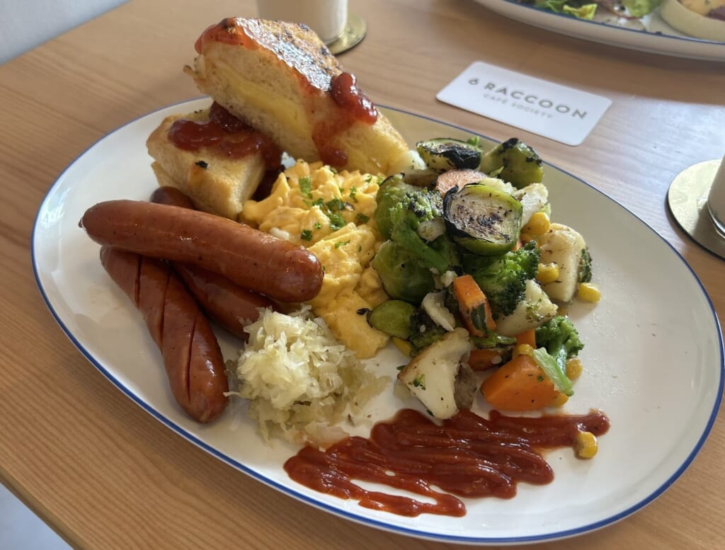 外はカリッ・中はもちっとした自家製パンにソーセージ、自家製ザワークラウトと、彩り豊かなベジタブルソテーが添えられた一品。ほどよい酸味や野菜の甘みが加わることで、バランス良く朝でもぺろりと食べてしまう一皿◎