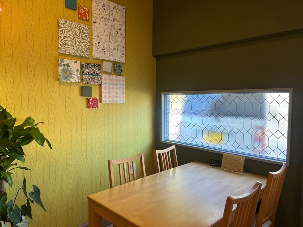 扉を開けると、色鮮やかな壁紙で明るい雰囲気が広がっています♩木の温もりと壁紙の柄がおしゃれで落ち着く空間。“ 居心地の良い時間 ” を過ごせる場所です。