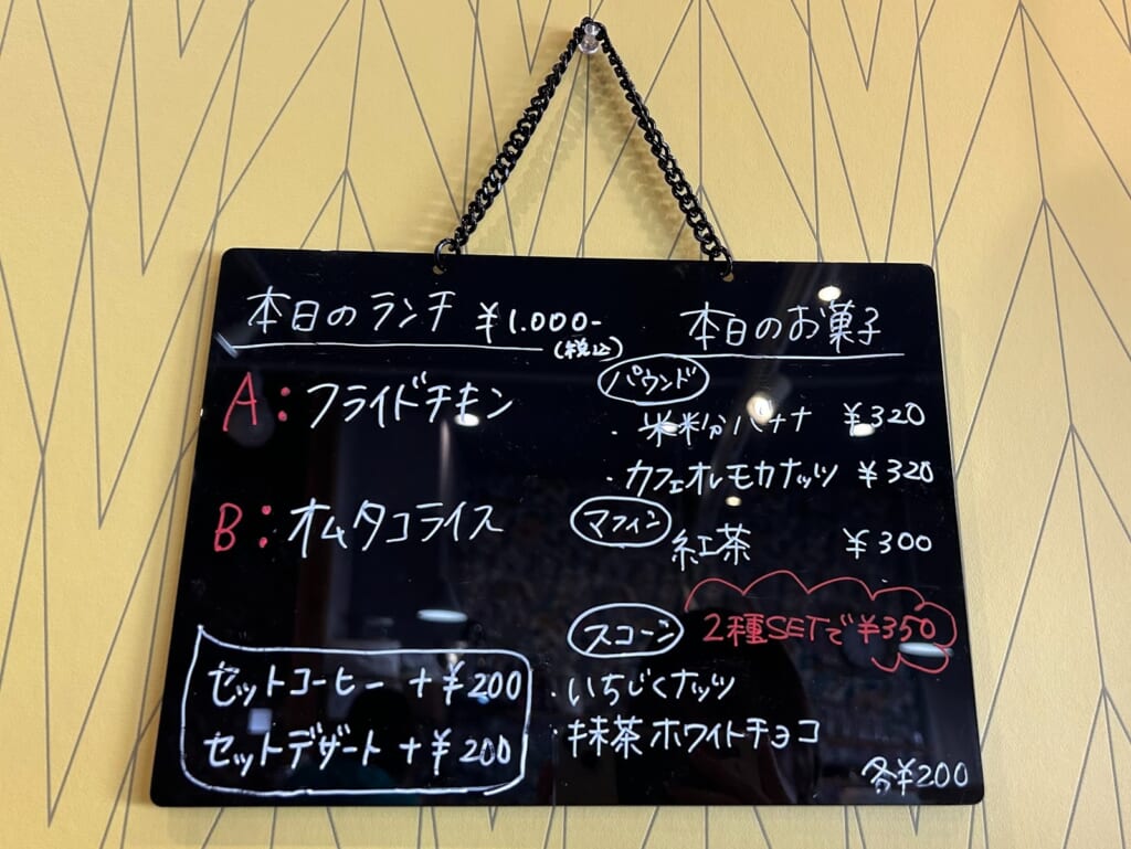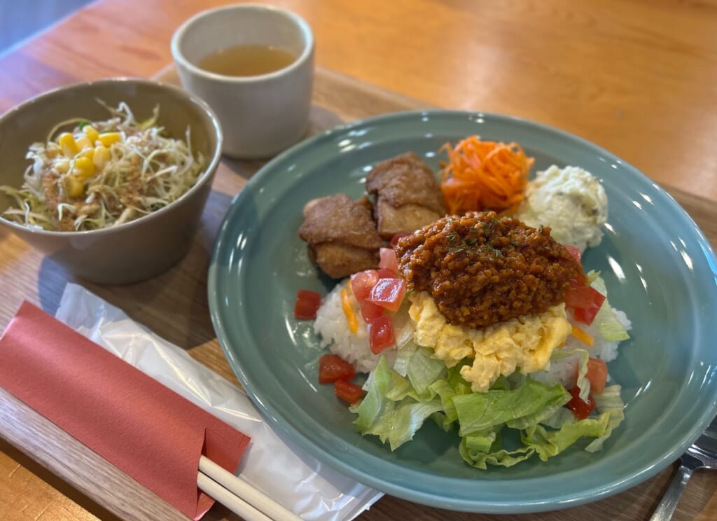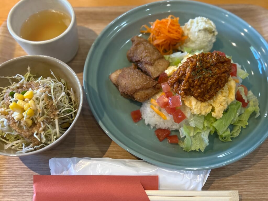 ランチメニューは” 日替わり2種類 “から選べる内容になっています。この日は「フライドチキン」と「オムタコライス」。毎日違うジャンルのメニューなので、来るたびに新しい美味しさに出会えます♩