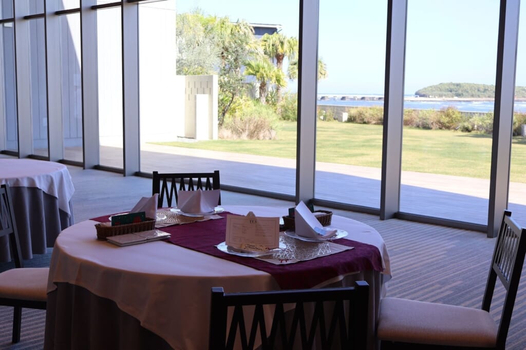 まずテーブルに座ると視界に飛び込んでくるのは青島の綺麗な海。披露宴会場ということもあり、とても開放的です。天井高の全面ガラス張りの窓からは太陽の光が差し込んできてとても贅沢な空間。普段あまり入ることのない結婚式場の特別感を味わえますよ♩