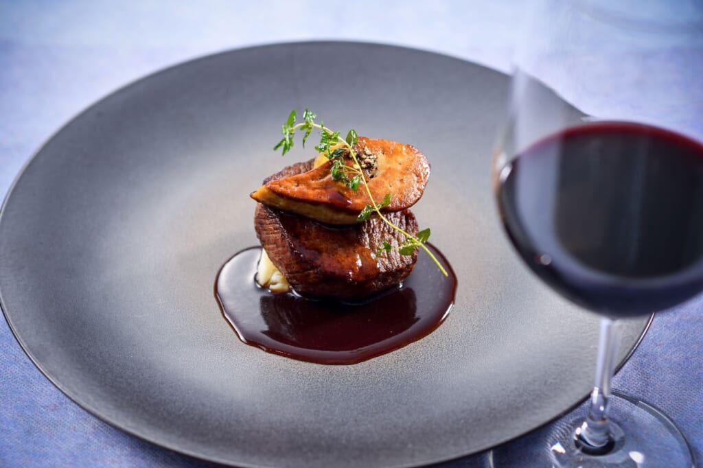 小林市の“富永和牛”の赤身肉とフォアグラを贅沢に重ね、自家製フォンドボーとマディラ酒、トリュフで香りづけした特製ソースで仕上げられています。