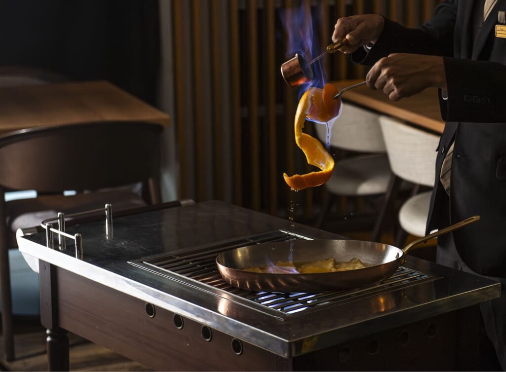デザートを目の前で仕上げるライブ演出も魅力の一つです。ナイトティー限定の「クレープシュゼット」は、スタッフが客席の目の前で調理してくれます。